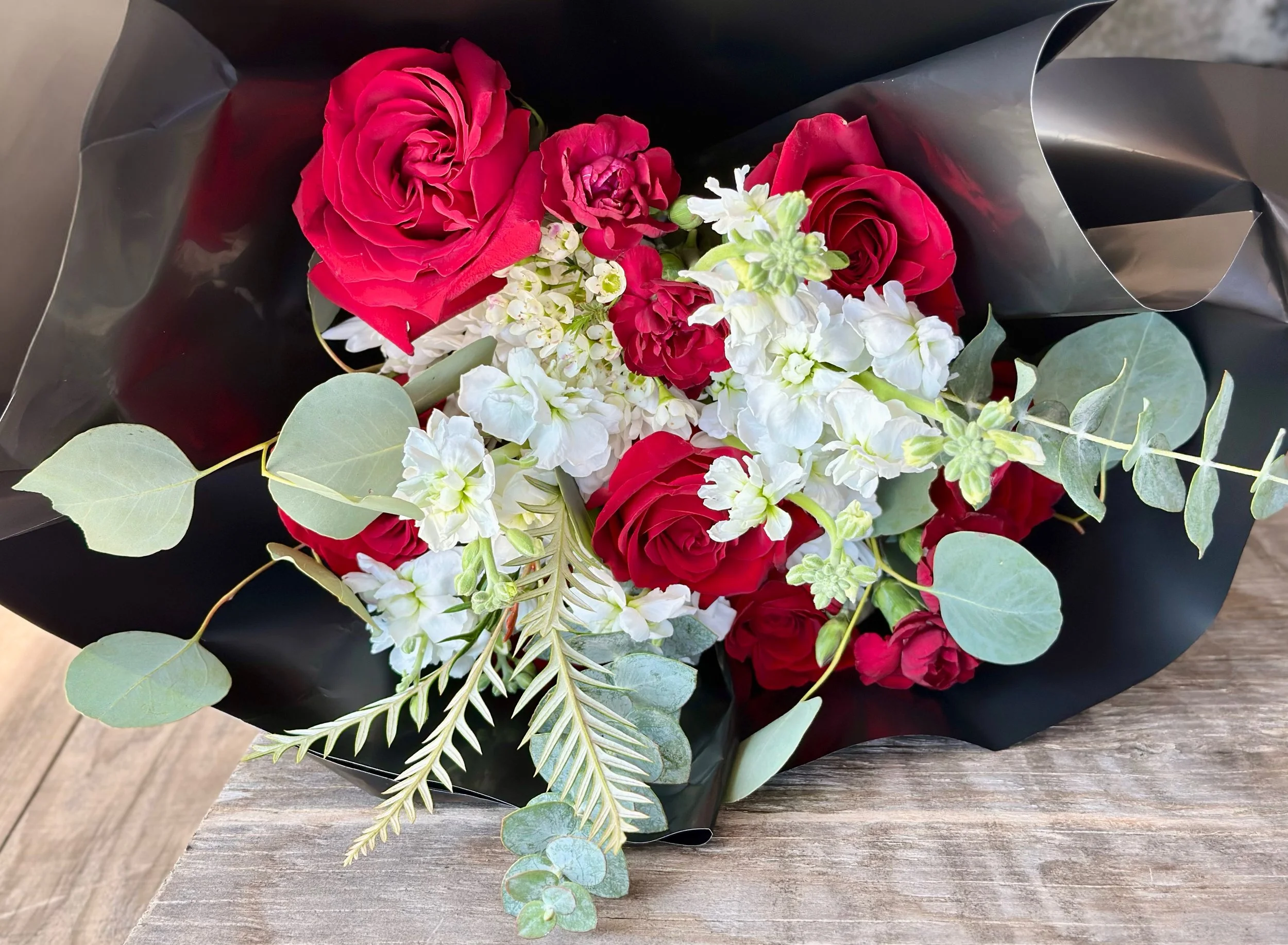 Passion and elegance in a hand-tied bouquet featuring red roses, hydrangeas, other romantic flowers, and fragrant eucalyptus - love in full bloom.