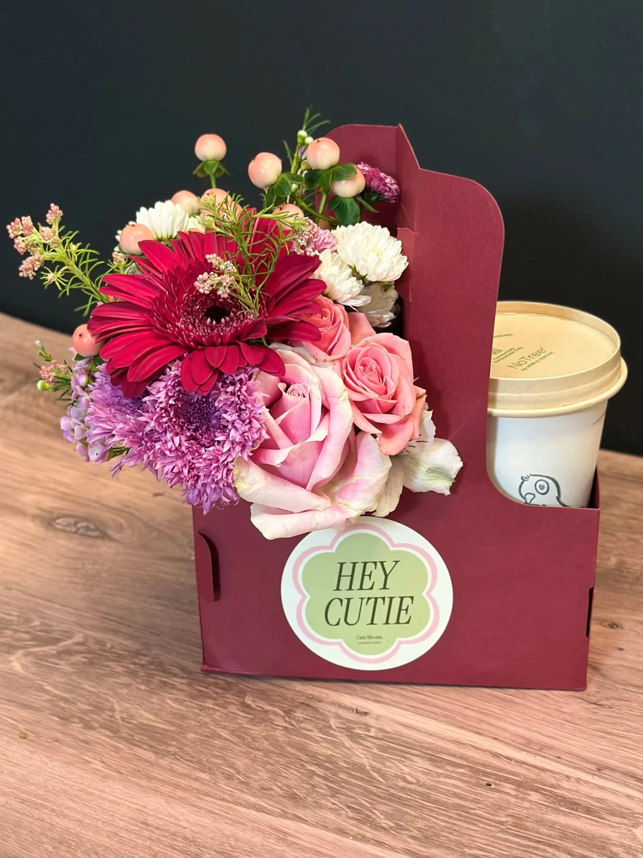This fun and flirty arrangement features roses and other cheerful blooms, arranged in a small vase tucked into a drink tray with a space for their favorite hot or cold beverage or treat.*